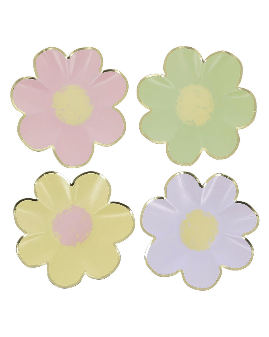 Virkelig skønne blomster paptallerkener med guld kant i 4 flotte pastelfarver, som er udformet som smukke blomster med en let fordybning i midten. Dæk et spektakulært bord til barnedåben, fødselsdagen eller en anden særlig lejlighed med disse forårsfinheder og glæd dig over en engangsservice, der er noget helt udover det sædvanlige, samtidig med at det bliver let og enkelt at holde fest