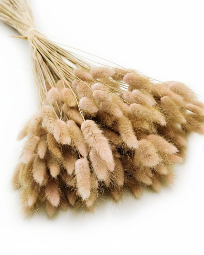 Smukke caffé latte farvede tørrede harehaler, også kaldet lagurus, med en højde på ca. 40 cm., som du her får 30 stk. af. De fine tørrede blomster er perfekte som pynt på det smukt dækkede bord til bryllupsfesten, barnedåben, konfirmationen og andre skønne begivenheder.