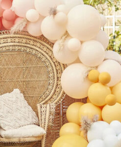 Utrolig flot og dekorativ douce pastelfarvet ballonguirlande, som du selv nemt kan lave til din fest. Kittet indeholder 75 balloner i forskellige størrelser indenfor en farvepalet bestående af blush koral, fersken, creme og mint nuancer, og det indeholder alt, hvad du skal bruge, for at lave den mest imponerende ballondekoration i det skønne pastelfarvede look. Forsynet med en ballonpumpe er det blot at gå i gang, og det er ikke svært, selvom resultatet ligner en million. Vi garanterer for, at både gæster og festens midtpunkt vil blive blæst bagover af synet af den super smukke ballonguirlande.