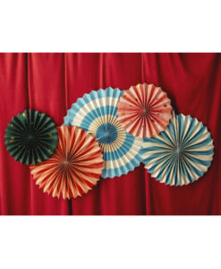 Pin wheels er lette papvifter, der foldes ud og kan hænges op på vægge, lofter, teltduge eller bruges som baggrund til et dessert- eller gavebord. Når de hænger samlet i forskellige størrelser, giver de et imponerende og farverigt udtryk, der straks skaber en gennemført cirkusstemning. De fungerer både som enkeltstående pynt og i kombination med balloner, guirlander eller honeycomb papirbolde.