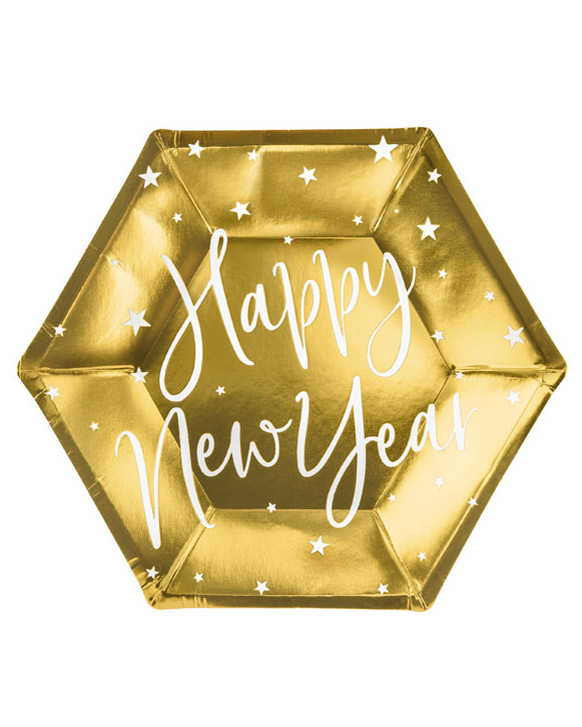 Smukke guld Happy New Year paptallerkener, som er perfekte på årets sidste aften, når det både skal være nemt og super flot og stilfuldt på én og samme gang. De flotte guld folie tallerkener med stjerner og teksten “Happy New Year” i den fineste skrift er et must i nytårsborddækningen, og der fås selvfølgelig også matchende papkrus, så du kan skabe et flot nytårsbord i et gennemført look.