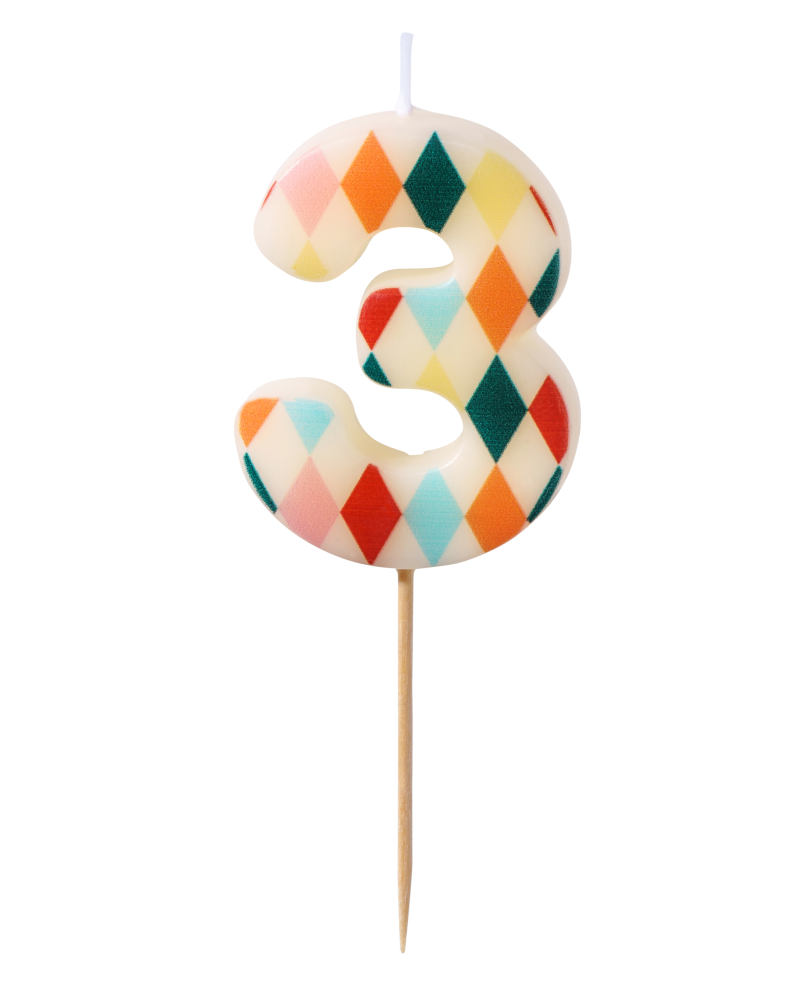 Det fineste harlekinternet 3-tals fødselsdagslys i skønne farver med rigtig retro charme til en herlig fødselsdagsfejring. Fejr den helt specielle dag med manér og pynt lagkagen, kagemanden eller en enkelt cupcake med det skønne lys, som helt sikkert vil gøre lykke hos små fødselarer. Lyset sidder på en lille fod og er lige til at sætte i kagen.