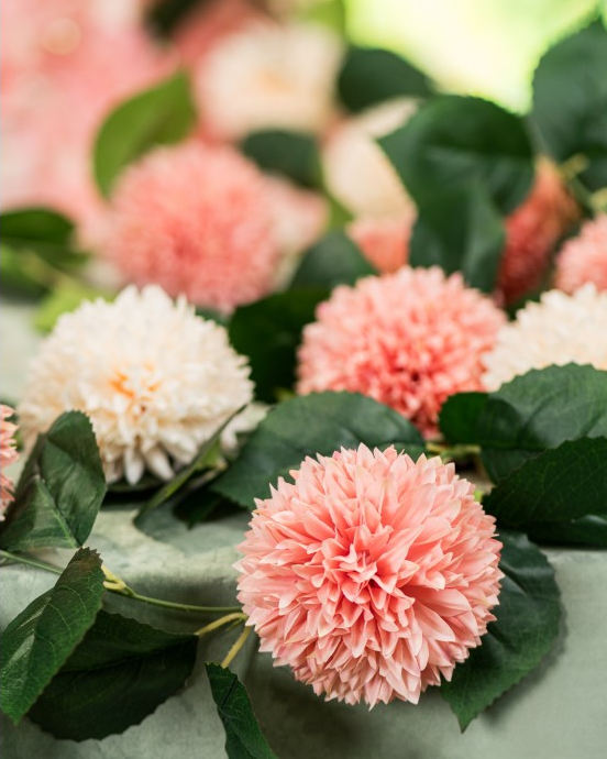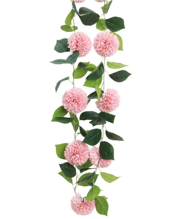 Smuk, dekorativ og naturtro kunstig lyserød dahlia guirlande med et væld af skønne blomsterhoveder, som er perfekt som stemningsskaber til festen, hvor naturen gerne må bringes med indenfor i festlokalet.