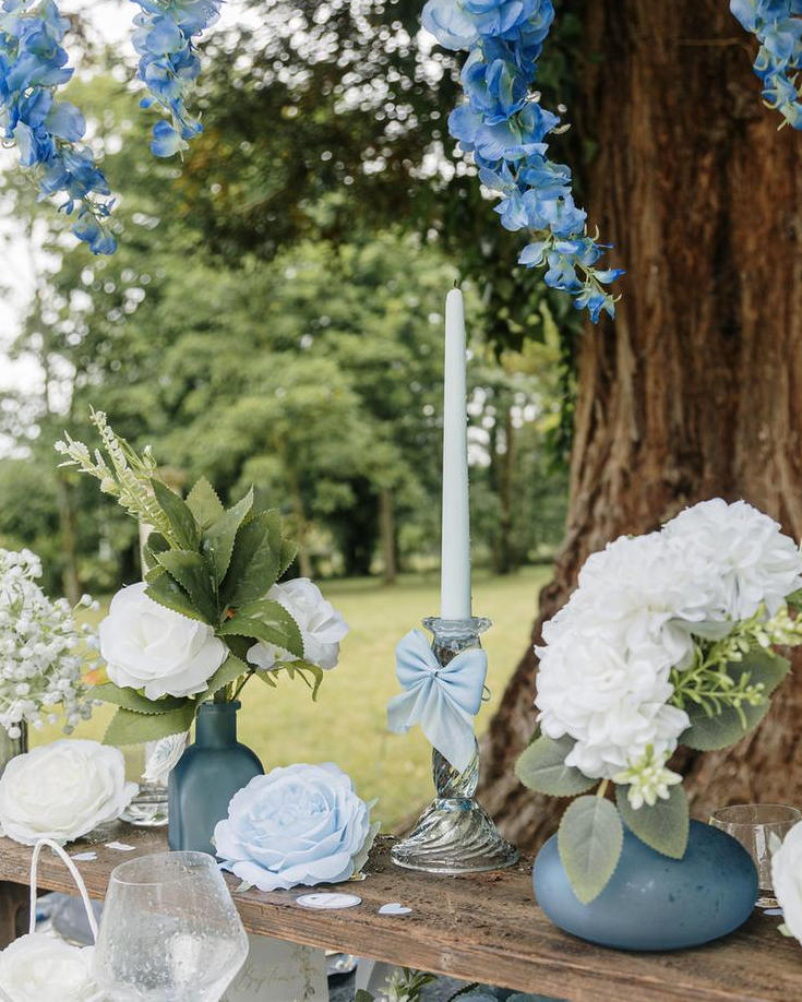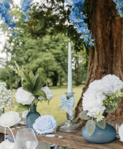De små vaser kan placeres enkeltvis eller i små grupper, direkte på dugen eller på en smuk bordløber. De er også utroligt fine på en rustik træskive, som på den måde kommer til at fungere som den flotteste center piece på festbordet.