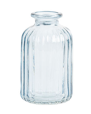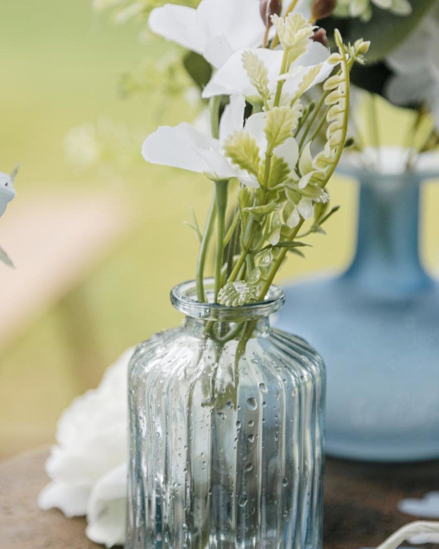 Flot og stilfuld lille lyseblå rillet glasvase med en højde på 10 cm. til små buketter af friske blomster, strå, tørrede blomster eller små kviste. Lad vaserne pynte fint på dit festbord og skab en smuk og elegant borddækning til barnedåben, konfirmationen, brylluppet og alle andre skønne begivenheder, I skal fejre.