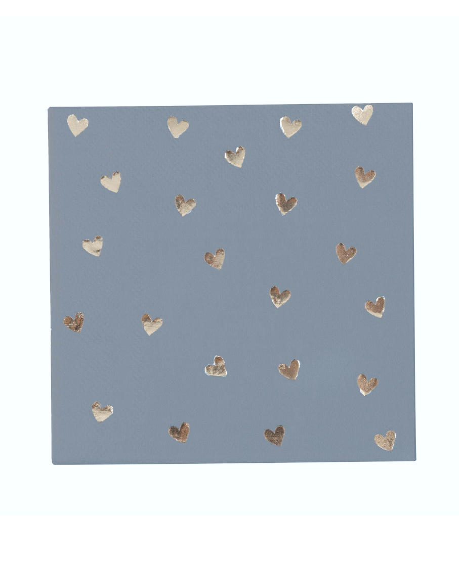 De fineste små lyseblå hjerte servietter med guld folie i en størrelse, der passer perfekt til kagebordet, dessertbuffeten, candy baren, brunch eller tapas.